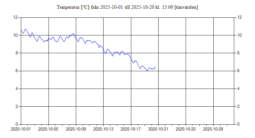 Vattentemperatur i Fyrisån uppströms Islandsfallet vid pumphuset, Uppsala för oktober 2025