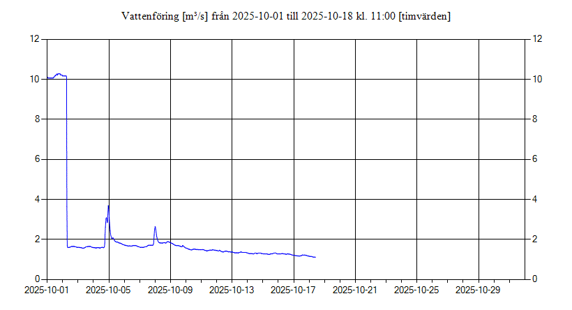 Vattenföring i Fyrisån uppströms Islandsfallet vid pumphuset, Uppsala för oktober 2025