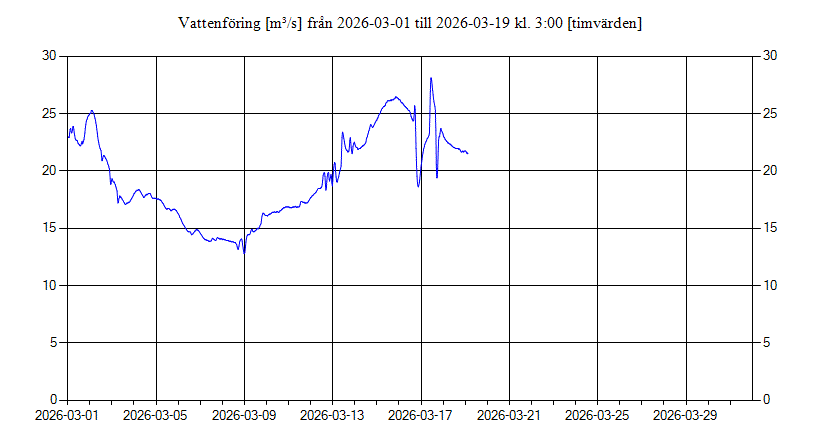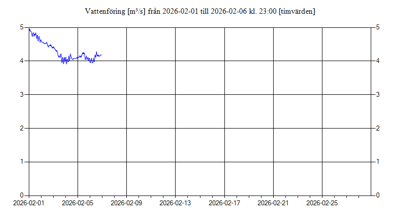 Vattenföring i Fyrisån uppströms Islandsfallet vid pumphuset, Uppsala för februari 2026